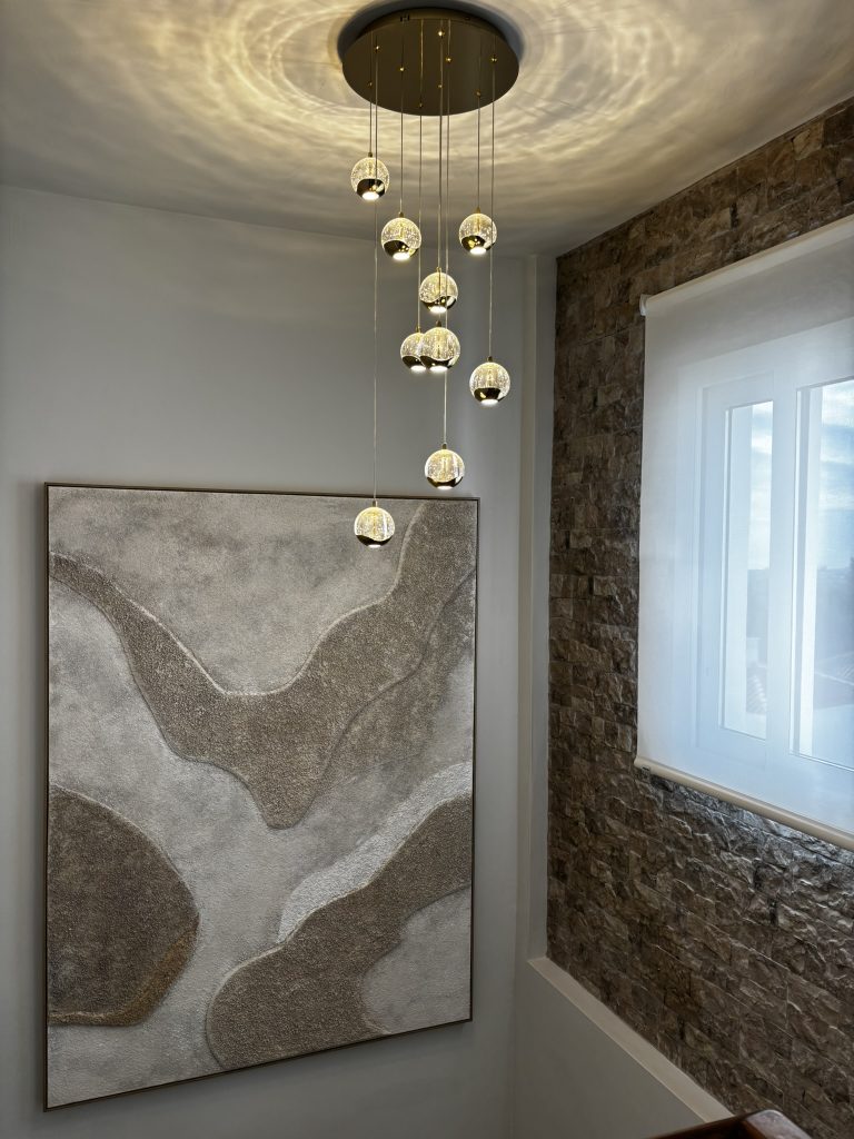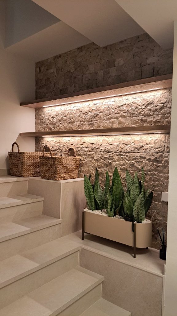 Como este hueco bajo la escalera, que pasó de ser un espacio muerto a una pieza de diseño en piedra y luz.